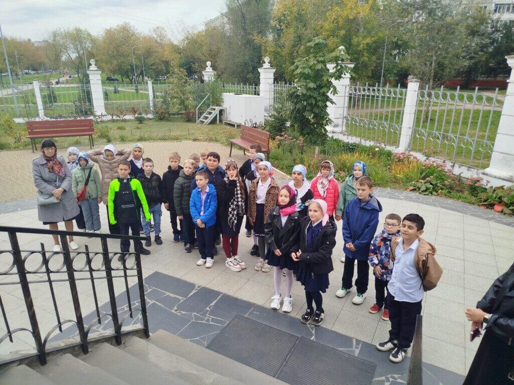 На экскурсии отец Александр рассказал об истории строительства центрального храма благочиния, которому в прошлом году исполнилось 20 лет. Также священник рассказал ученикам, на какие части делится храм, что происходит во время богослужения в каждой из частей, какой символизм имеет количество куполов в храмах. Внутри храма ученикам рассказывали об устройстве иконостаса, истории центрального образа «скоропослушница». Особенно интересно детям было рассматривать богослужебные сосуды и утварь: отец Александр показал детям потир, дискос, звездицу, лжицу, копие, воздух и покровцы, подробно объяснил, для чего нужен каждый предмет на богослужении. Также священник продемонстрировал устройство кадила и разрешил детям подержать его в руках. Этой возможностью ученики охотно воспользовались.